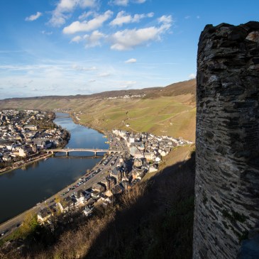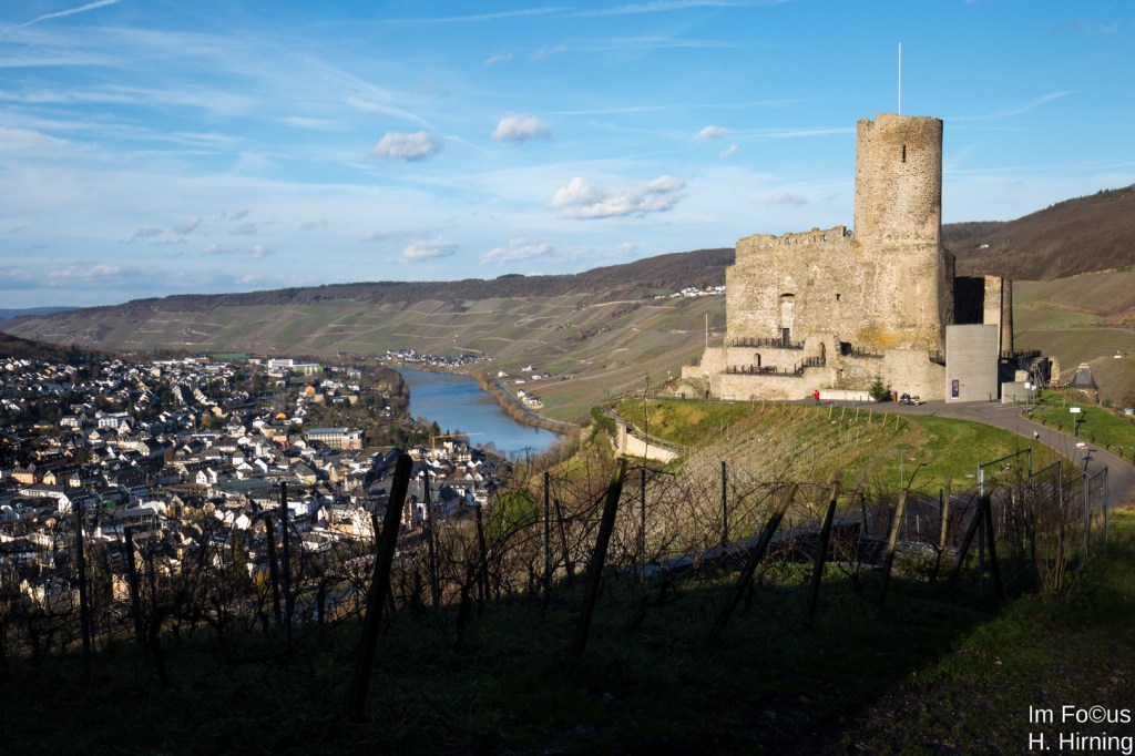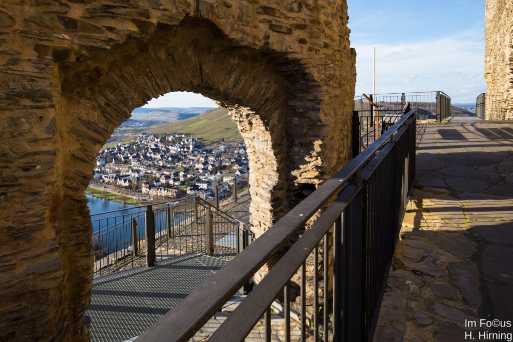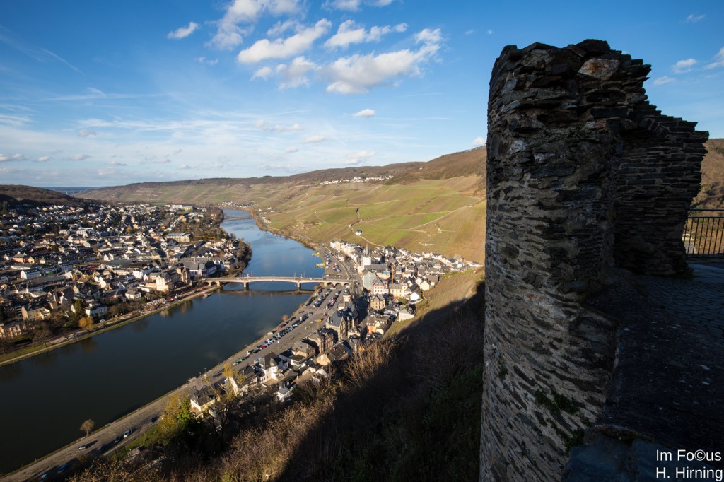 Von der Burg aus genießt man einen herrlichen Blick über das Tal, das die Mosel in engen Windungen tief in die schiefrigen Berge geschnitten hat.