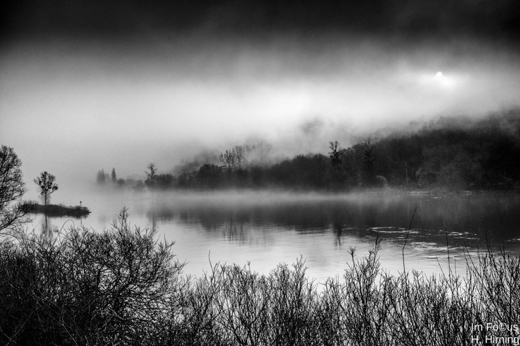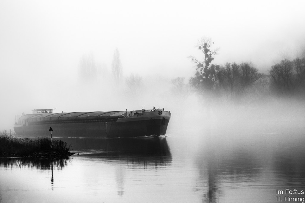 Insbesondere überm Wasser verdichtete sich der Nebel zu einem jegliche Struktur auflösenden Schleier. Es war schon fast gespenstisch, als aus dem grauen Nichts unvermittelt ein Frachtschiff auftauchte, das langsam, aber unaufhaltsam, den Fluss aufwärts glitt.