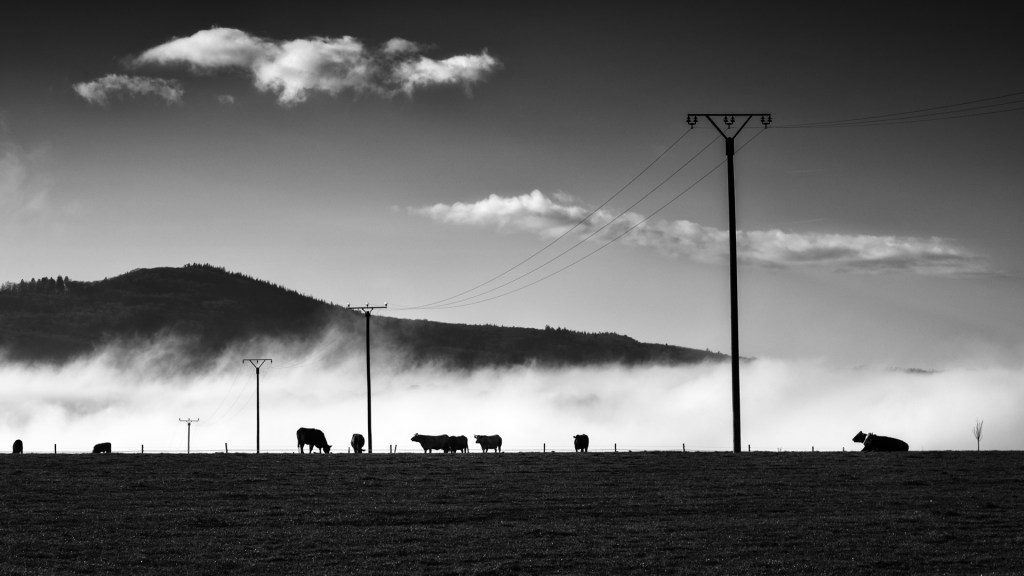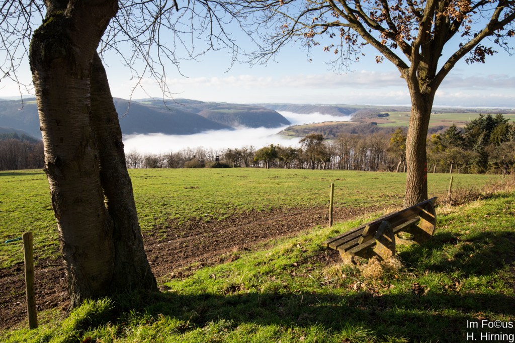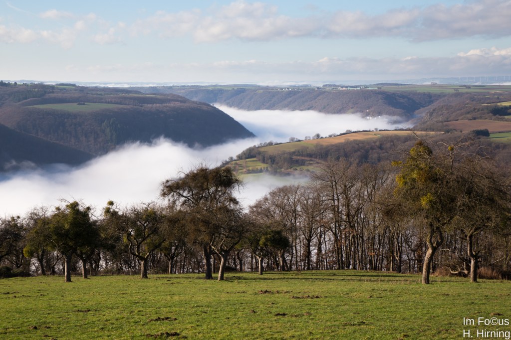 In den Höhenlagen oberhalb der Mosel wechselten sich Nebel und Sonne auf kurze Distanz ab. Ausdruckstark die alte Allee und die Rinder vor den aufsteigenden Nebelfetzen, die uns eher an eine amerikanische Farm, denn an das Moseltal erinnerten.