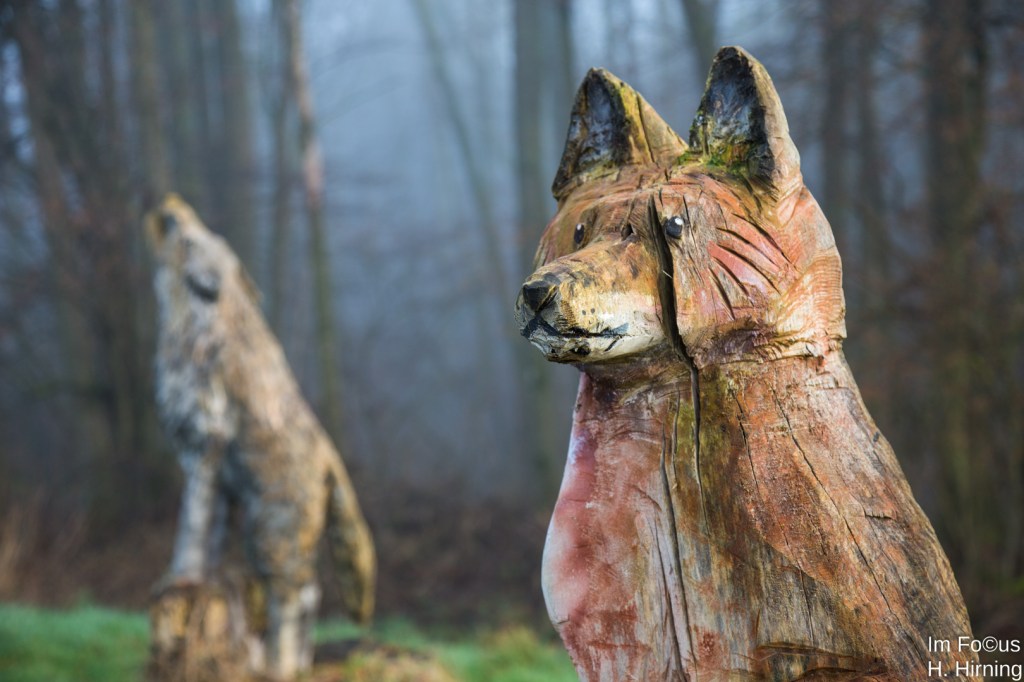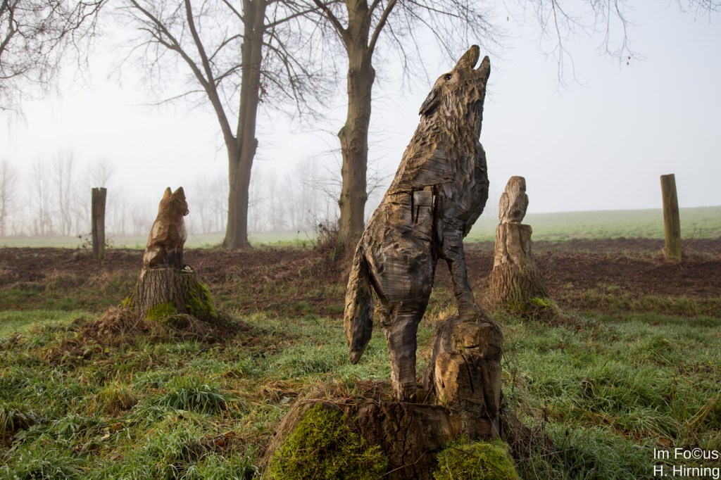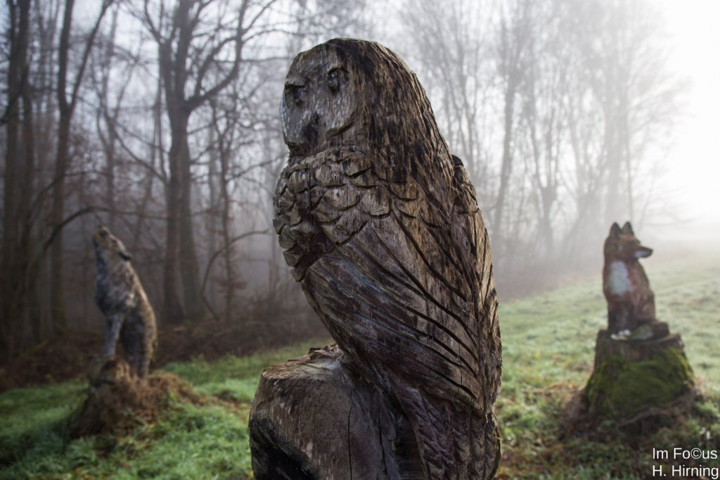 Der Nebel, der mal dicht über dem Wasser, mal in mittlerer Höhe waberte, produzierte seine eigenen Bilder. Nahe dem Weiler Müdenberg, oberhalb des Moseltals gelegen, stießen wir an einem Waldrand auf die nachfolgenden Skulpturen. Ein Zettel offenbarte, dass es sich um Kettensägenkunst von Sonja Krämer handelt. Bei Interesse einfach anrufen. Tel.: 02653 4179.
